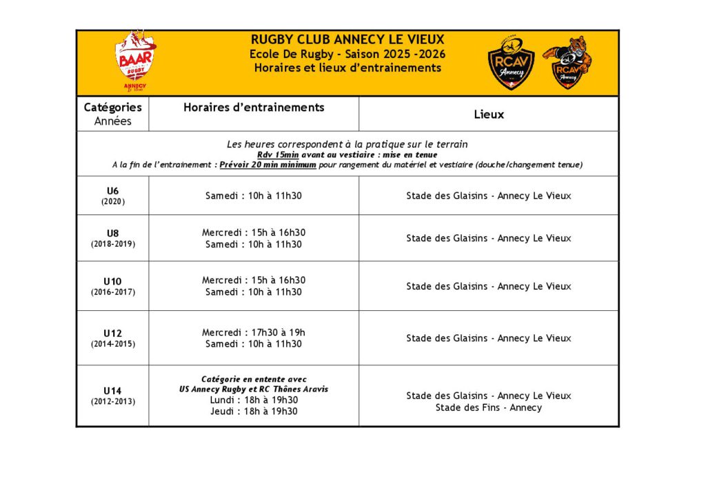 Vous trouverez ci-dessous les horaires d’entraînement pour la saison en cours.